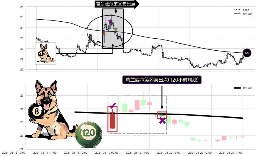 ⚀ 2021-08-20 10:00:00-小时显现 葛兰威尔均线 120小时均线 第⑧卖出点 下降趋势的中继信号,后市看跌,卖出信号