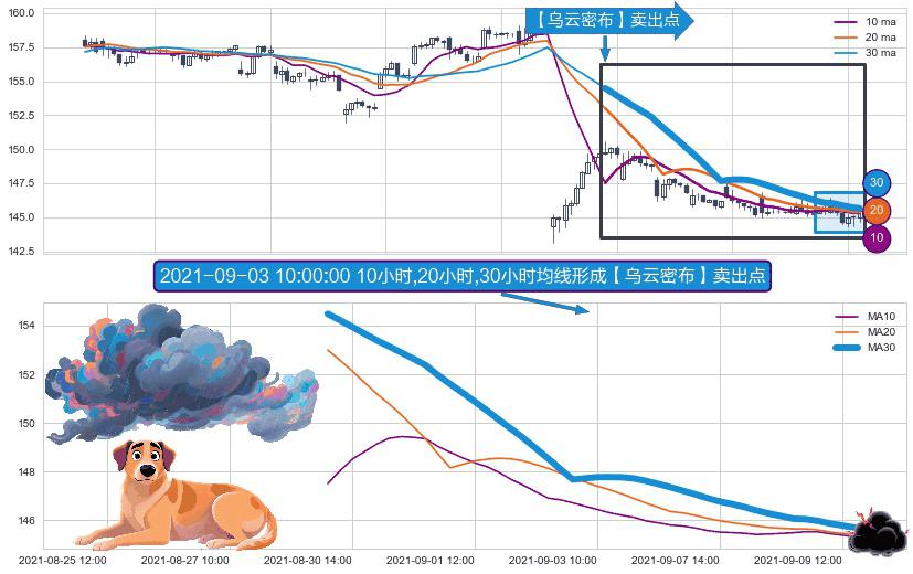 形态多维评估: ⚀ 2021-08-30 12:00:00小时-2021-09-09 14:00:00小时显现 10小时-20小时-30小时均线 【乌云密布】卖出点 看空信号,后市看跌,卖出
