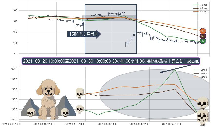 形态多维评估: ⚀ 2021-08-20 11:00:00-小时至2021-08-30 10:00:00-小时显现 30小时-60小时-90小时均线 【死亡谷】卖出点 看空信号,后市看跌,卖出