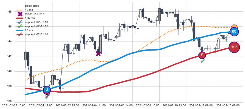 上涨趋势01-29 10:00-02-16 09:00,均线105, 60确认关键支撑2处