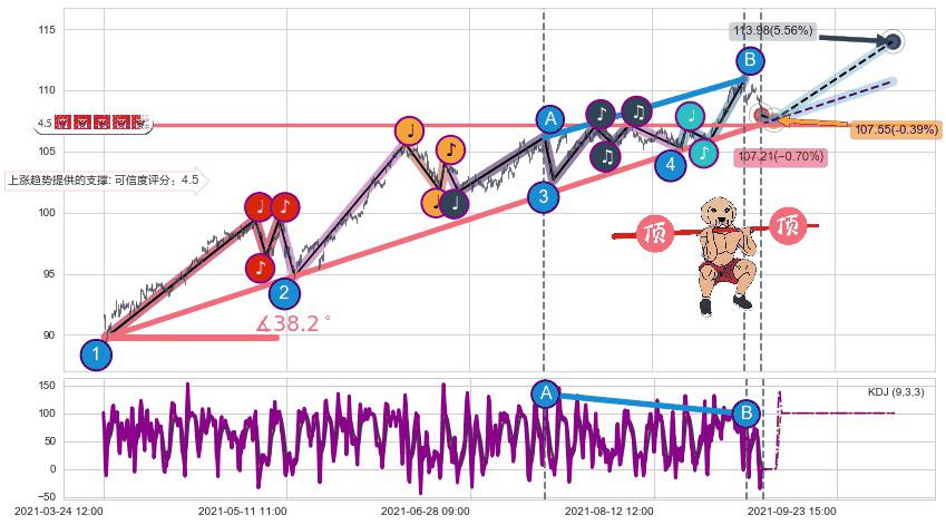 ♘ 在最后的上升阶段2021-03-25 09:00至2021-09-09 13:00存在 持续未破位的支撑位 ,支撑价格107.21,支撑可信任强度88.51%,其距离最后价格107.97相差 -0.70%