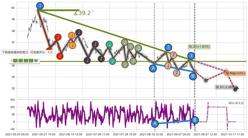 ♘ 在最后的下跌阶段2021-05-10 10:00至2021-09-09 15:00,存在 持续未破位的阻力位 ,阻力价格55.37,可信任强度83.72%,其距离最后价格54.47相差 +1.65%