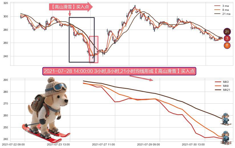 形态多维评估: ⚀ 2021-07-26 10:00:00小时-2021-08-02 10:00:00小时显现 3小时-8小时-21小时均线 【高山滑雪】买入点 看多信号,后市看涨,买入