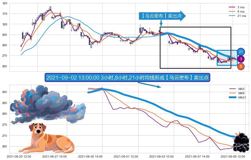 形态多维评估: ⚀ 2021-08-30 10:00:00小时-2021-09-09 10:00:00小时显现 3小时-8小时-21小时均线 【乌云密布】卖出点 看空信号,后市看跌,卖出