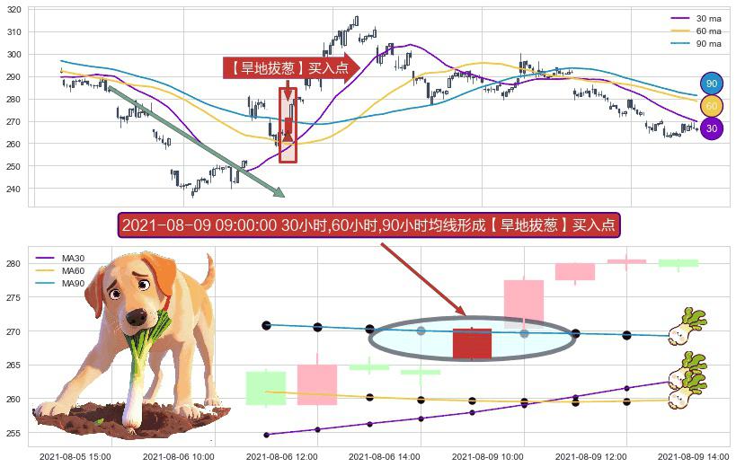 形态多维评估: ⚀ 2021-08-09 09:00:00小时显现 30小时-60小时-90小时均线 【旱地拔葱】买入点 看多信号,后市看涨,买入