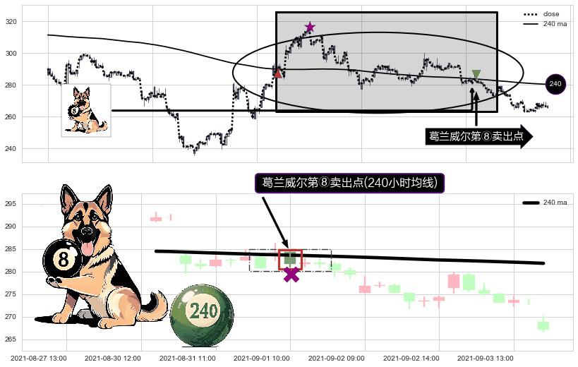 形态多维评估: ⚀ 2021-09-01 10:00:00-小时显现 葛兰威尔均线 240小时均线 第⑧卖出点 下降趋势的中继信号,后市看跌,卖出信号