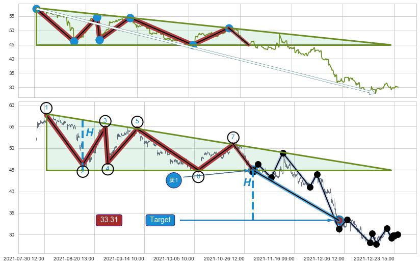 ➣ 最小中继整理跌幅→𝐇: 11.63 (下侧直角边第一支撑点②与斜边垂直距离)