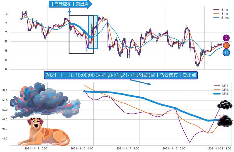 形态多维评估: ⚀ 2021-11-16 09:00:00小时-2021-11-22 11:00:00小时显现 3小时-8小时-21小时均线 【乌云密布】卖出点 看空信号,后市看跌,卖出