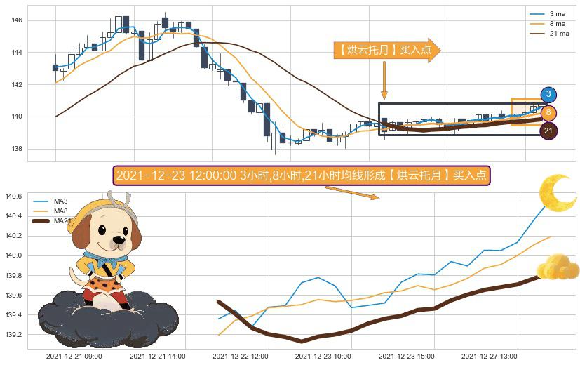 形态多维评估: ⚀ 2021-12-22 09:00:00小时-2021-12-27 15:00:00小时显现 3小时-8小时-21小时均线 【烘云托月】买入点 看多信号,后市看涨,买入