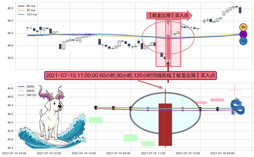 形态多维评估: ⚀ 2021-07-15 11:00:00小时显现 60小时-90小时-120小时均线 【蛟龙出海】买入点 看多信号,后市看涨,买入