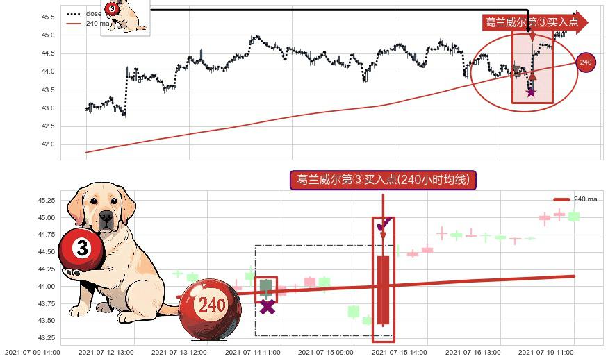 形态多维评估: ⚀ 2021-07-15 11:00:00-小时显现 葛兰威尔均线 240小时均线 第③买入点 上升趋势的中继信号,后市看涨,买进信号