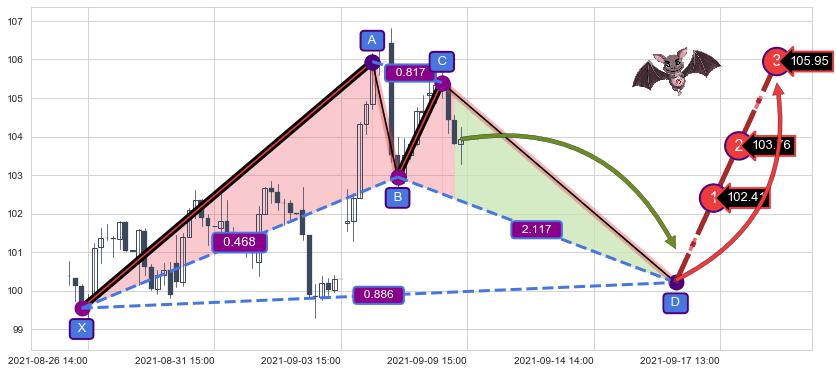 ➣ 未完成【蝙蝠】形态起点X: 08-26:13, 已到达C点: 09-09:11, 预测最终D点: 09-16:13, 共94交易小时