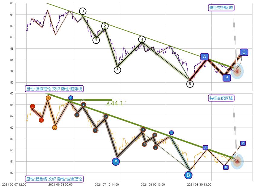 🦴 长线均值回复组合短线趋势跟踪[强阻力信号]2021-07-01 11:00-2021-08-23 14:00下跌趋势依然成立(下跌趋势跟踪依然存在),短线价格略微上行反弹(均值回复猜想),即将接近下跌趋势提供的未破位阻力价格:54.81。
