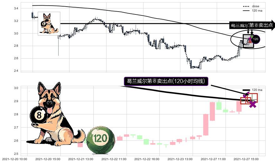 形态多维评估: ⚀ 2021-12-27 15:00:00-小时显现 葛兰威尔均线 120小时均线 第⑧卖出点 下降趋势的中继信号,后市看跌,卖出信号
