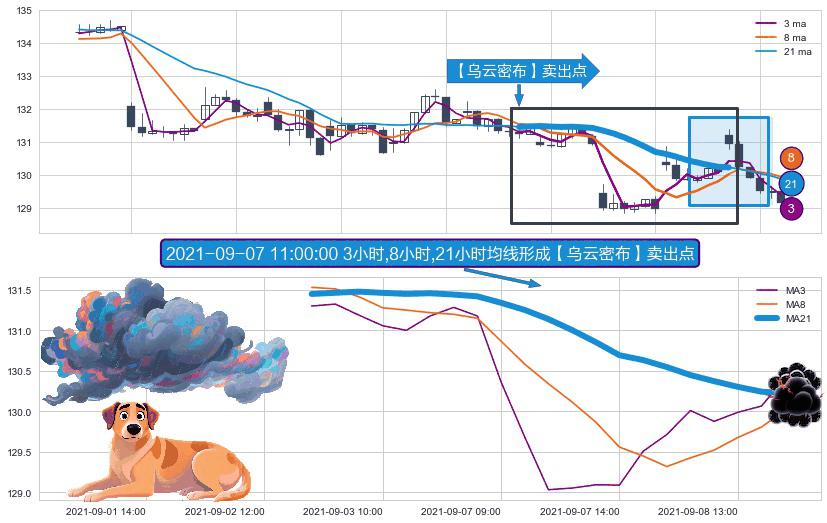 形态多维评估: ⚀ 2021-09-02 14:00:00小时-2021-09-09 09:00:00小时显现 3小时-8小时-21小时均线 【乌云密布】卖出点 看空信号,后市看跌,卖出