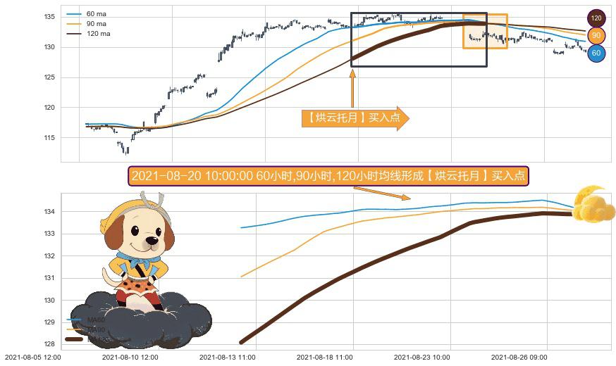 形态多维评估: ⚀ 2021-08-12 15:00:00小时-2021-08-27 10:00:00小时显现 60小时-90小时-120小时均线 【烘云托月】买入点 看多信号,后市看涨,买入