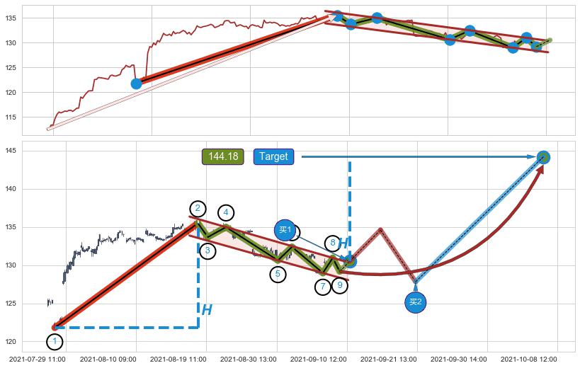从2021-07-30 09:00至2021-08-12 13:00,共包含64个小时,阶段股价上涨1.81%,阶段股价变动位移路程比: 1 : 7