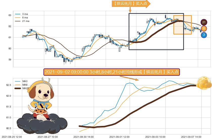 ⚀ 2021-08-30 10:00:00小时-2021-09-07 14:00:00小时显现 3小时-8小时-21小时均线 【烘云托月】买入点 看多信号,后市看涨,买入
