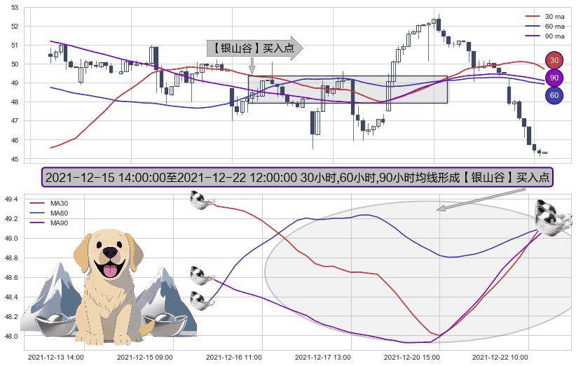 形态多维评估: ⚀ 2021-12-15 15:00:00-小时至2021-12-22 12:00:00-小时显现 30小时-60小时-90小时均线 【银山谷】买入点 看多信号,后市看涨,买入