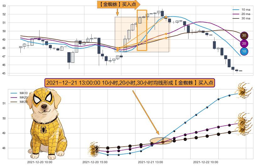 形态多维评估: ⚀ 2021-12-21 13:00:00小时显现 10小时-20小时-30小时均线 【金蜘蛛】买入点 看多信号,后市看涨,买入