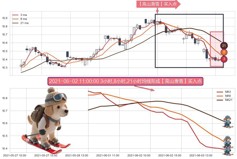 形态多维评估: ⚀ 2021-05-28 13:00:00小时-2021-06-03 15:00:00小时显现 3小时-8小时-21小时均线 【高山滑雪】买入点 看多信号,后市看涨,买入