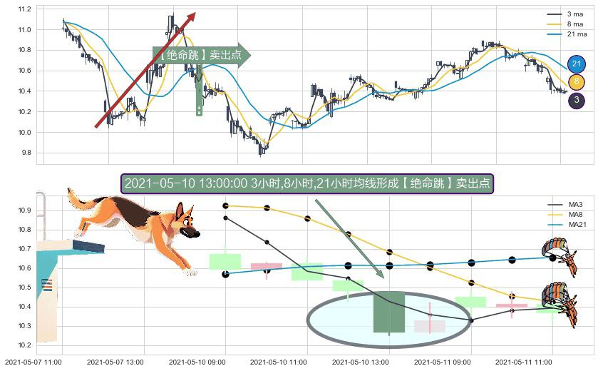 形态多维评估: ⚀ 2021-05-10 13:00:00小时显现 3小时-8小时-21小时均线 【绝命跳】卖出点 看空信号,后市看跌,卖出