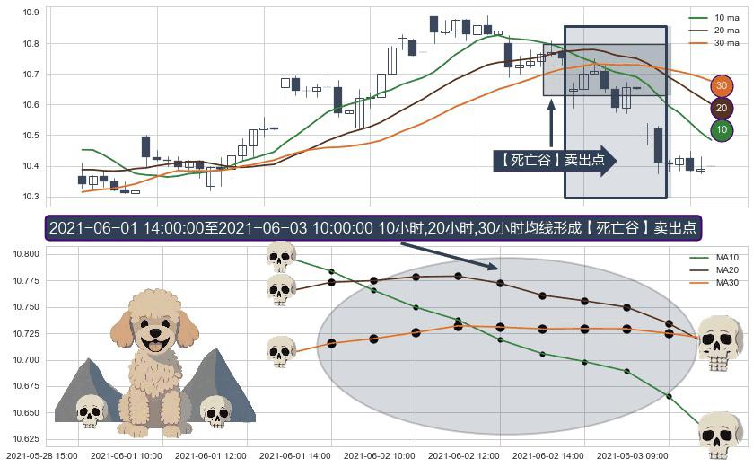 形态多维评估: ⚀ 2021-06-02 09:00:00-小时至2021-06-03 10:00:00-小时显现 10小时-20小时-30小时均线 【死亡谷】卖出点 看空信号,后市看跌,卖出