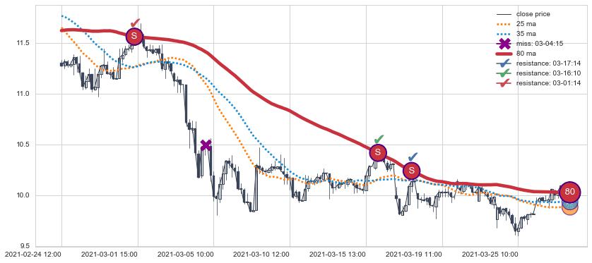 下跌趋势02-24 12:00-03-29 11:00,均线80确认关键阻力3处