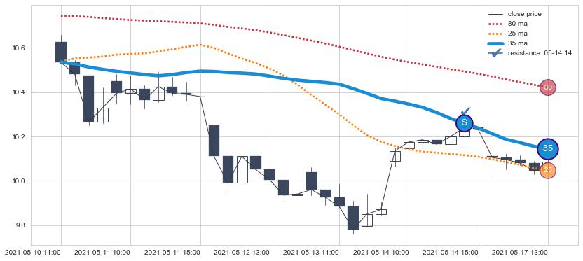 下跌趋势05-10 11:00-05-17 13:00,均线35确认关键阻力1处