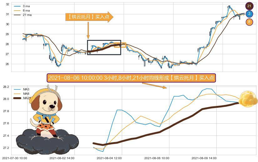 形态多维评估: ⚀ 2021-08-03 12:00:00小时-2021-08-10 14:00:00小时显现 3小时-8小时-21小时均线 【烘云托月】买入点 看多信号,后市看涨,买入