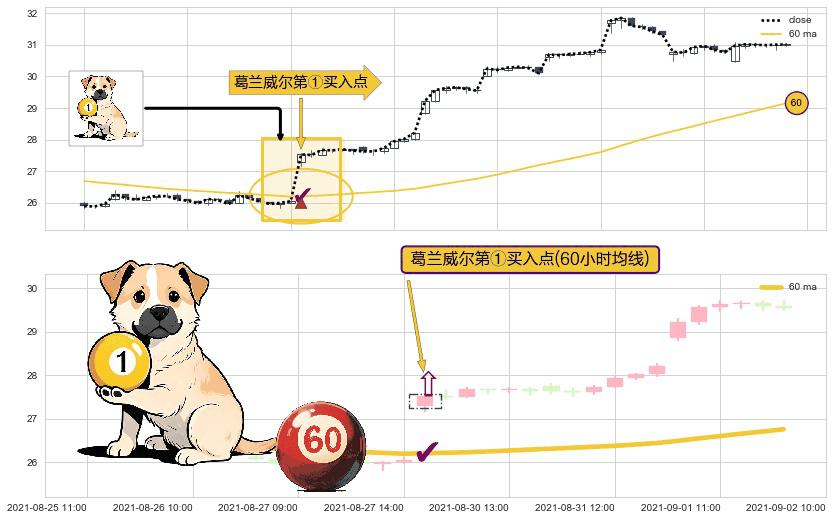 形态多维评估: ⚀ 2021-08-30 09:00:00-小时显现 葛兰威尔均线 60小时均线 第买①入点 走势反转见底信号,后市看涨,买进信号