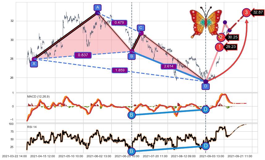 ➣ 已完成【蝴蝶】形态起点X: 03-29:09, 终点D: 08-19:14, 共611交易小时