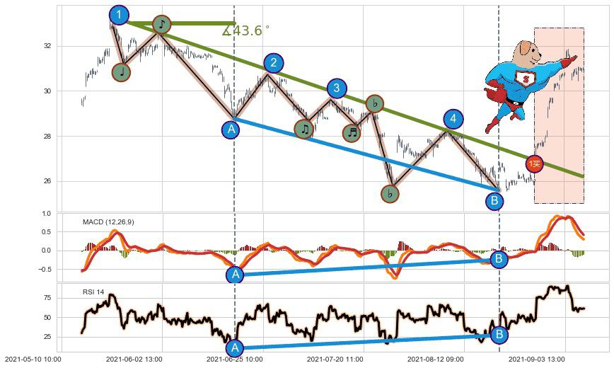 ➣ 【RSI】下跌趋势出现【常规背离 & 反转信号】背离程度32.39%,背离夹角角度44.7˚,背离程度中等