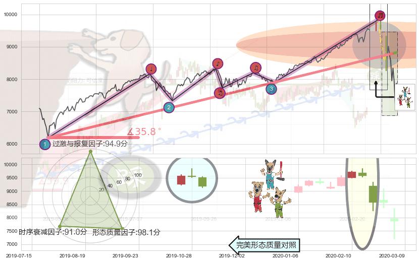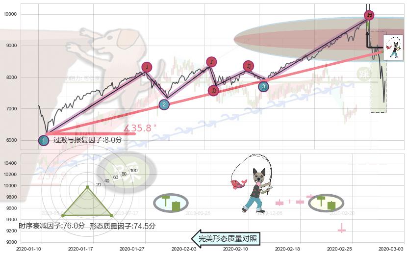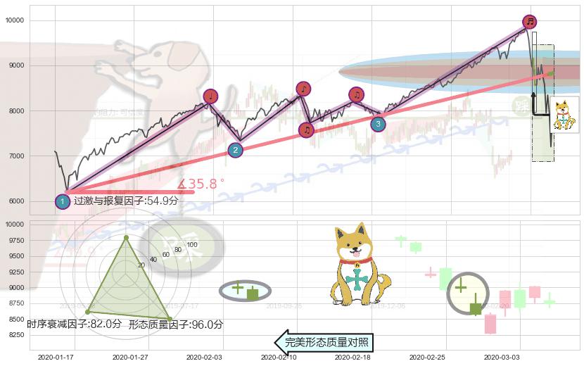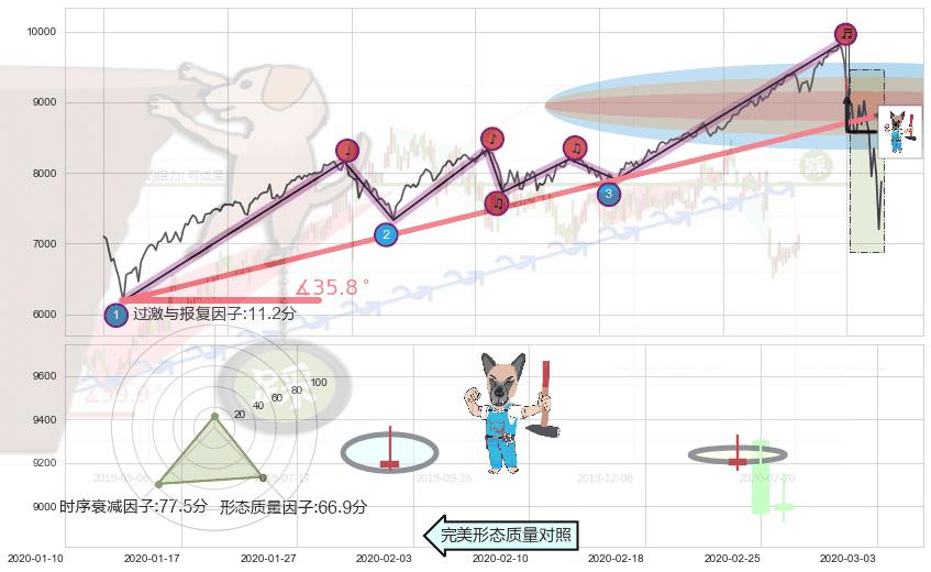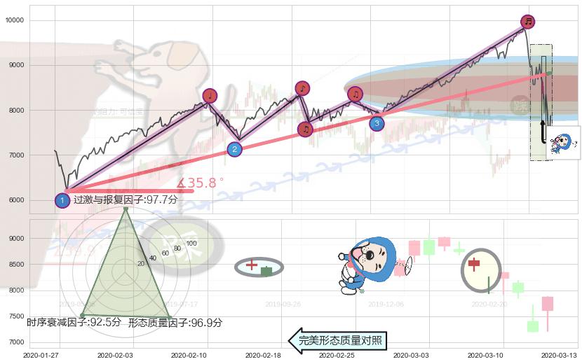 ➣ 2018-12-24-2020-03-11上升趋势存在反转[风险],其原上升趋势的支撑位(8823.63)已破位[强阻力信号],原上升趋势角度: 35.8˚
