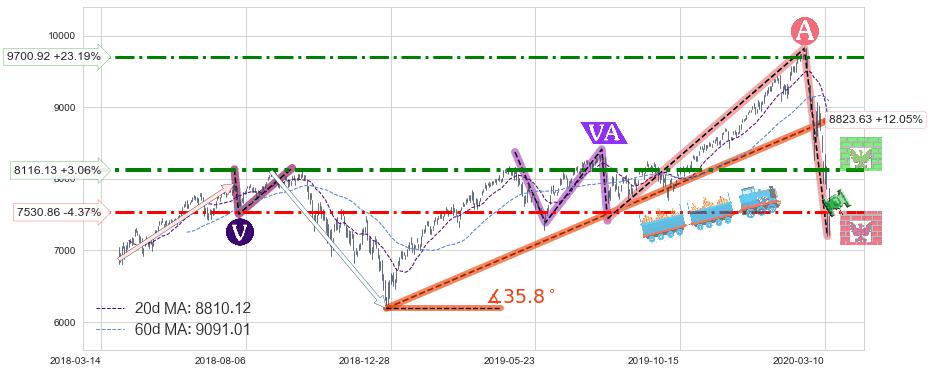 ✂️ 2018-12-24-2020-03-11上升趋势存在反转[风险],其原上升趋势的支撑位(8823.63)已破位[强阻力信号],原上升趋势角度: 35.8˚