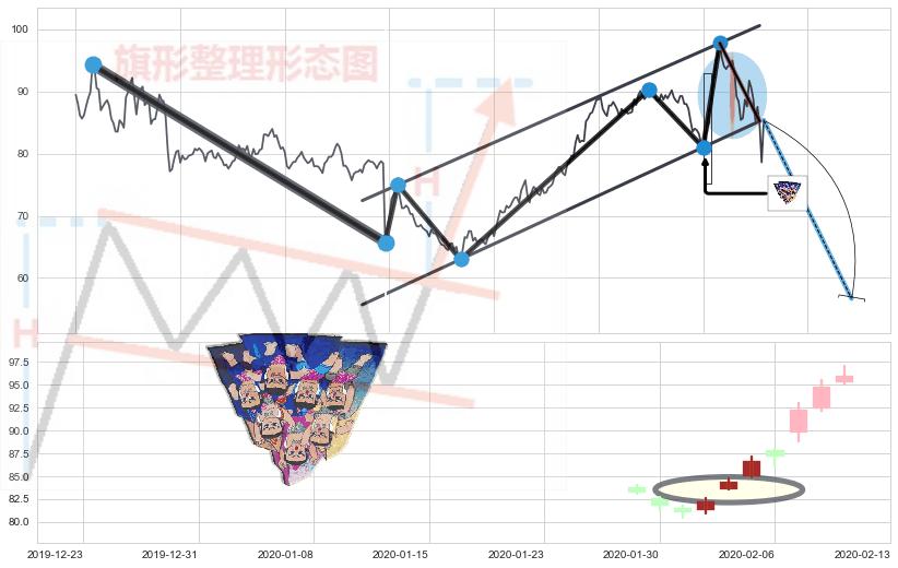 ➢ 升旗形:关键支撑位被击穿 → 猜想形成趋势持续下跌 → 风险信号 → 大趋势均值回复