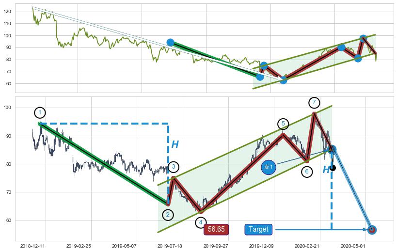 ➣ D点拟合预测价格107.90,距离最后交易收盘价格85.37相差 +26.40%