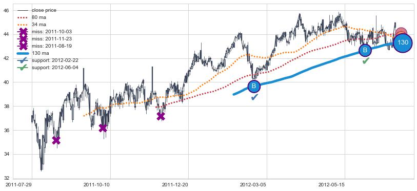 ➢ 最优均线组合共正确确认支撑阻力信号16处,正确确认率 55.17%