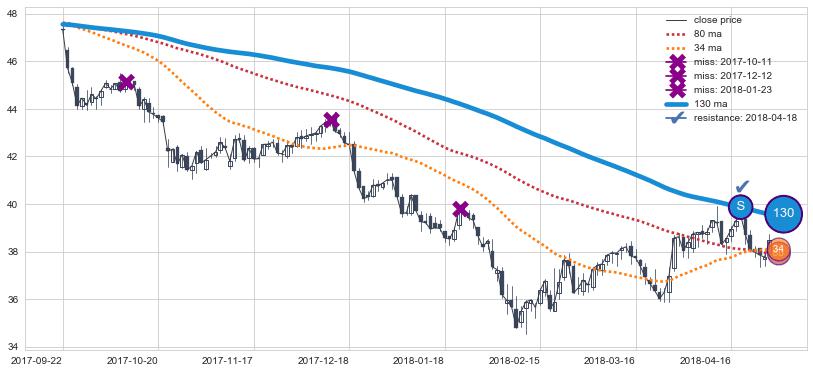 2017-09-22至2018-04-26 慢线与快线呈空头排列, 慢线与快线接触少,无缠绕
