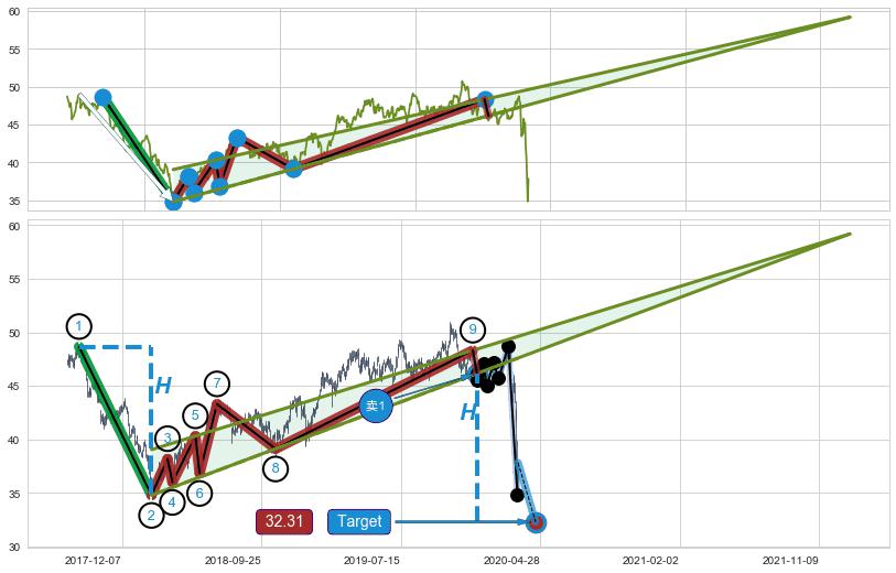 ➢ 最小中继整理跌幅→𝐇: 13.85 (𝐇楔型旗杆的长度:楔型起点→顶点)