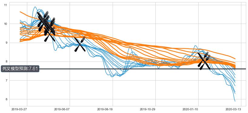 ➣ 40小时均线于(2019-04-23: 10.25)形成【死叉】基于【死叉历史模型】预测死叉后最低波谷价格: 8.54, 死叉后最低价格5.41,已经下跌超出预测最低波谷价格, 预期反弹