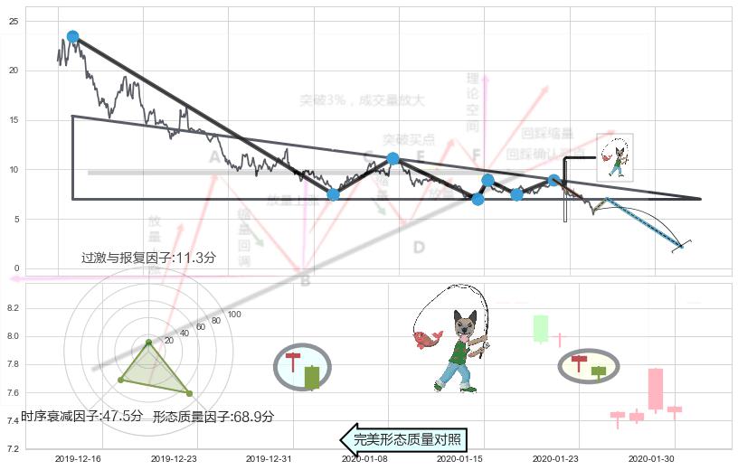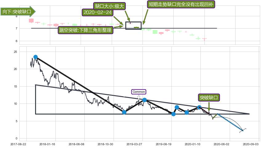 ➢ 【多方力量耗尽,空方打破攻守平衡点】下降三角形中继整理, 已在2020-02-24突破【支撑】颈线 7.02 →演变成下降通道
