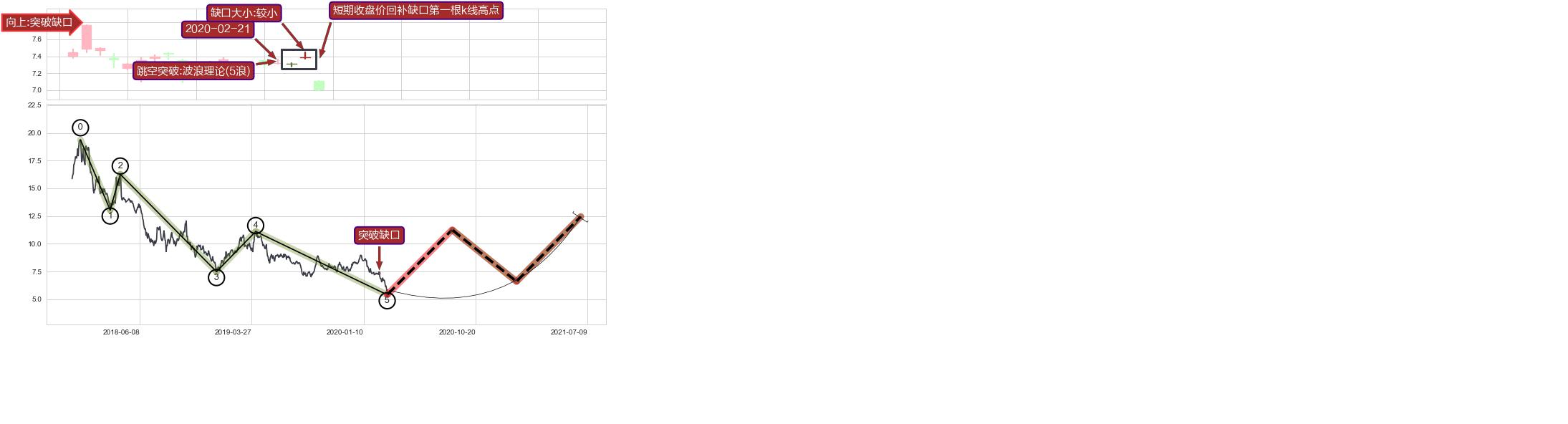 ➢ 突破缺口形成后,后续k已经超过14根,跳空突破波浪理论(5浪)关键点后, 出现【完全回踩】迹象,短期收盘价回补缺口第一根k线高点