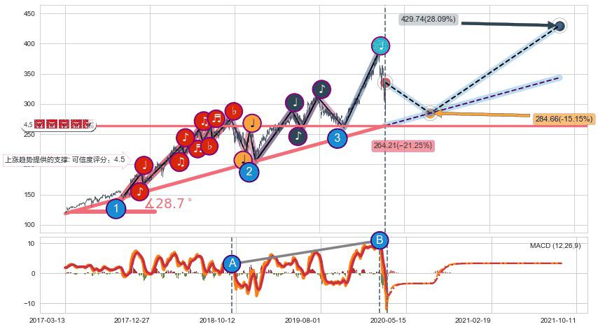 ♘ 在最后的上升阶段2017-03-14至2020-03-11存在 持续未破位的支撑位 ,支撑价格264.21,支撑可信任强度88.17%,其距离最后价格335.50相差 -21.25%