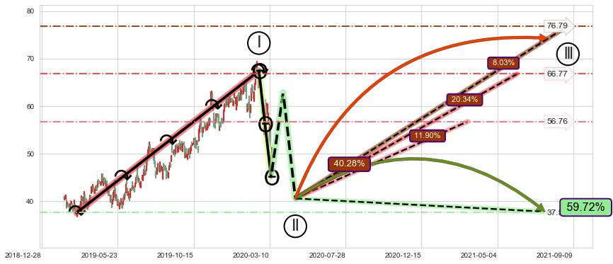 ➣ 高概率大级别循环上涨浪被破坏,反转向下(突破5浪起点)概率59.72%