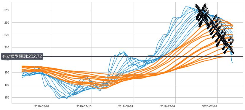 ➣ 80小时均线于(2020-02-11: 228.12)形成【死叉】基于【死叉历史模型】预测死叉后最低波谷价格: 210.87, 死叉后最低价格182.24,已经下跌超出预测最低波谷价格, 预期反弹