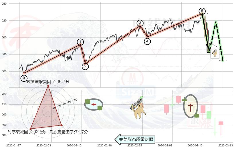 ➣ 看跌(高位倒锤头)流星线 + 波浪理论上涨浪:浪5回调拐点信号叠加后【反向回撤率】低,【看空】信号叠加【存续影响大】