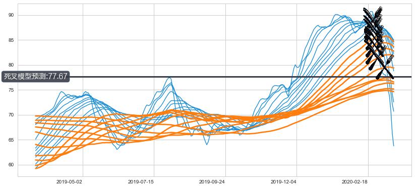 ➣ 90小时均线于(2020-02-24: 82.55)形成【死叉】基于【死叉历史模型】预测死叉后最低波谷价格: 76.15, 死叉后最低价格55.40,已经下跌超出预测最低波谷价格, 预期反弹