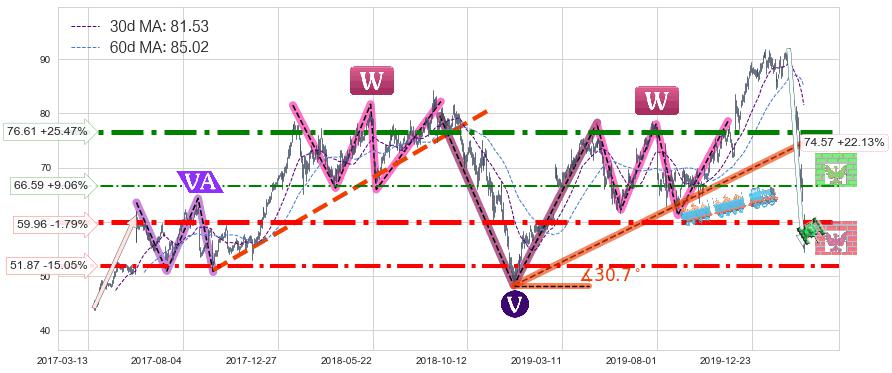 ♘ 阻力价格位76.61,可信任强度89.35%,距离最后交易2020-03-13形成的收盘价格61.06相差 +25.47%