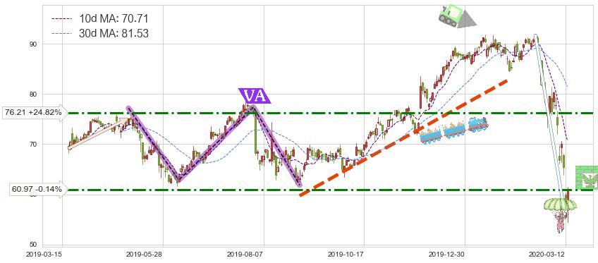 ♘ 阻力价格位76.21,可信任强度64.87%,距离最后交易2020-03-13形成的收盘价格61.06相差 +24.82%